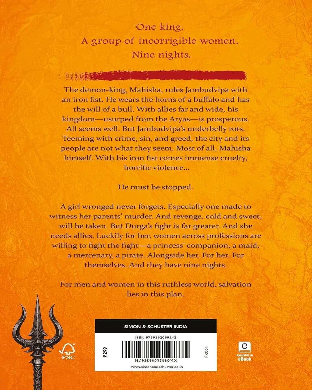 One king. A group of incorrigible women. Nine nights. The demon-king, Mahisha, rules Jambudvipa with an iron fist. He wears the horns of a buffalo and has the will of a bull. With allies far and wide, his kingdom—usurped from the Aryas—is prosperous. All seems aboveboard. But Jambudvipa’s underbelly rots. Teeming with crime, sin, and greed, the city and its people are not what they seem. Most of all, Mahisha himself. With his iron fist comes immense cruelty, horrific violence… He must be stopped. A girl wronged never forgets. Especially one made to witness her parents’ murder. And revenge, cold and sweet, will be taken. But Durga’s fight is far greater. And she needs allies. Luckily for her, women across professions are willing to fight the fight—a princess’ companion, a maid, a mercenary, a pirate. Alongside her. For her. For themselves. And they have nine nights. For men and women in this ruthless world, salvation lies in this plan.