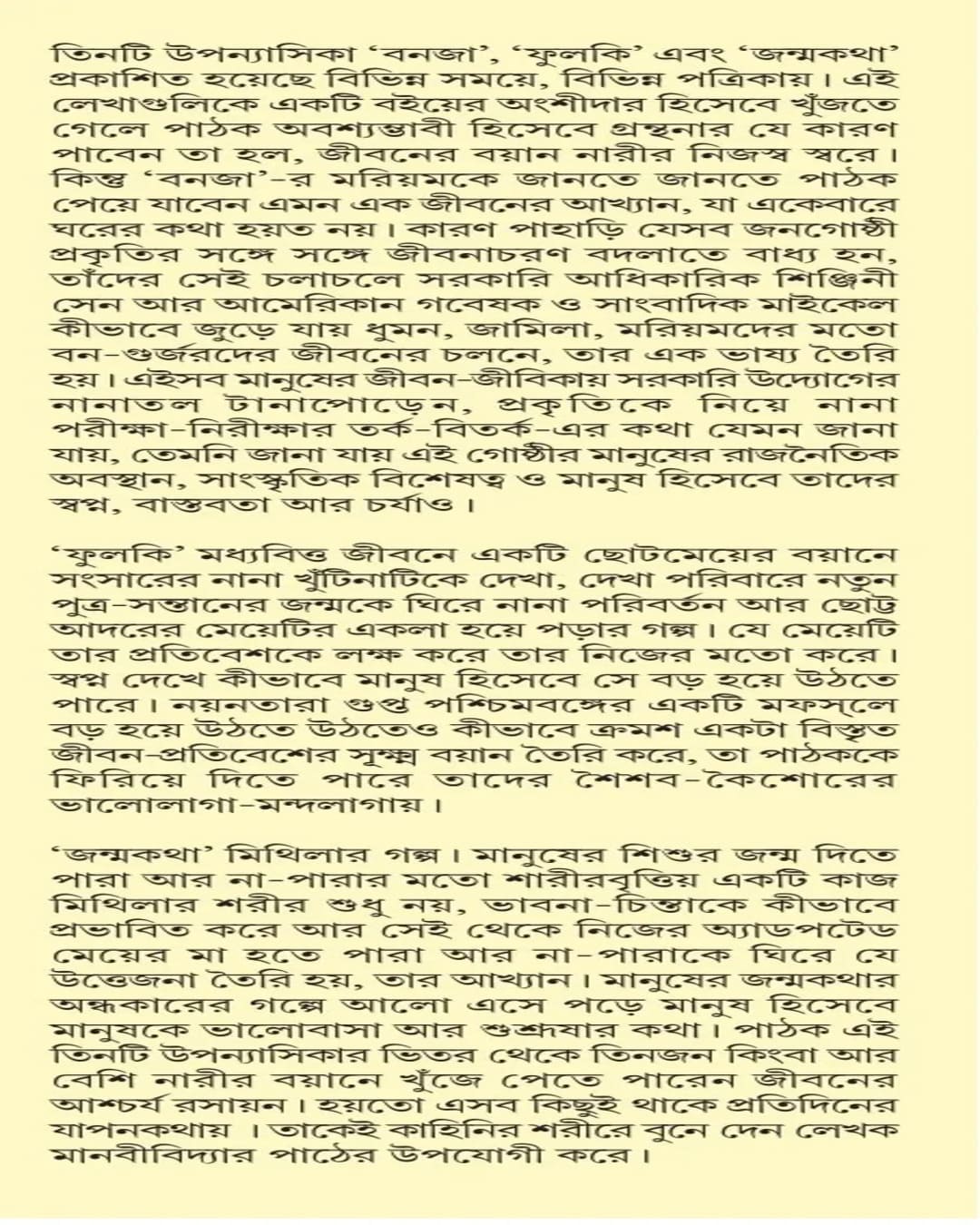 ‘জন্মকথা’ মিথিলার গল্প। মানুষের শিশুর জন্ম দিতে পারা আর না-পারার মতো শারীরবৃত্তিয় একটি কাজ মিথিলার শরীর শুধু নয়, ভাবনা-চিন্তাকে কীভাবে প্রভাবিত করে আর সেই থেকে নিজের অ্যাডপটেড মেয়ের মা হতে পারা আর না-পারাকে ঘিরে যে উত্তেজনা তৈরি হয়, তার আখ্যান। মানুষের জন্মকথার অন্ধকারের গল্পে আলো এসে পড়ে মানুষ হিসেবে মানুষকে ভালোবাসা আর শুশ্রূষার কথা। পাঠক এই তিনটি উপন্যাসিকার ভিতর থেকে তিনজন কিংবা আর বেশি নারীর বয়ানে খুঁজে পেতে পারেন জীবনের আশ্চর্য রসায়ন। হয়তো এসব কিছুই থাকে প্রতিদিনের যাপনকথায়। তাকেই কাহিনির শরীরে বুনে দেন লেখক মানবীবিদ্যার পাঠের উপযোগী করে।