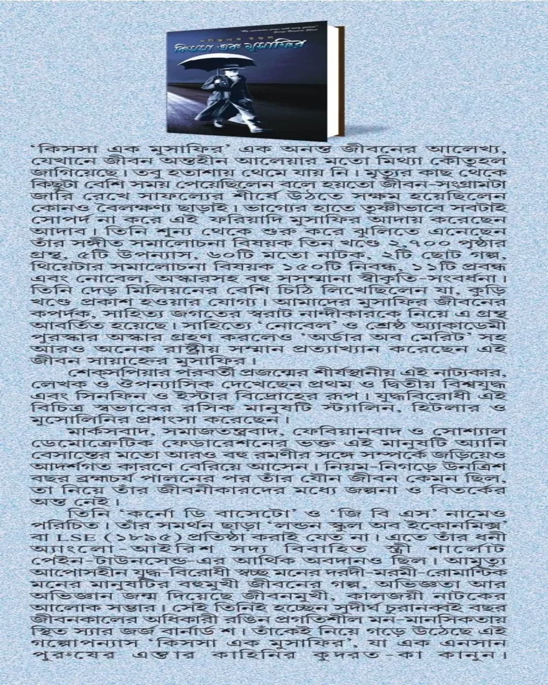 ‘কিসসা এক মুসাফির’ এক অনন্ত জীবনের আলেখ্য, যেখানে জীবন অন্তহীন আলেয়ার মতো মিথ্যা কৌতূহল জাগিয়েছে। তবু হতাশায় থেমে যায় নি। মৃত্যুর কাছ থেকে কিছুটা বেশি সময় পেয়েছিলেন বলে হয়তো জীবন-সংগ্রামটা জারি রেখে সাফল্যের শীর্ষে উঠতে সক্ষম হয়েছিলেন কোনও বৈলক্ষণ্য ছাড়াই। ভাগ্যের হাতে তৃষ্ণীভাবে সবটাই সোপর্দ না করে এই ফরিয়াদি মুসাফির আদায় করেছেন আদাব। তিনি শূন্য থেকে শুরু করে ঝুলিতে এনেছেন তাঁর সঙ্গীত সমালোচনা বিষয়ক তিন খণ্ডে ২,৭০০ পৃষ্ঠার গ্রন্থ, ৫টি উপন্যাস, ৬০টি মতো নাটক, ২টি ছোট গল্প, থিয়েটার সমালোচনা বিষয়ক ১৫০টি নিবন্ধ, ১১টি প্রবন্ধ এবং নোবেল, অস্কারসহ বহু সসম্মানা স্বীকৃতি-সংবর্ধনা। তিনি দেড় মিলিয়নের বেশি চিঠি লিখেছিলেন যা, কুড়ি খণ্ডে প্রকাশ হওয়ার যোগ্য। আমাদের মুসাফির জীবনের কপর্দক, সাহিত্য জগতের স্বরাট নান্দীকারকে নিয়ে এ গ্রন্থ আবর্তিত হয়েছে। সাহিত্যে ‘নোবেল’ ও শ্রেষ্ঠ অ্যাকাডেমী পুরস্কার অস্কার গ্রহণ করলেও ‘অর্ডার অব মেরিট’ সহ আরও অনেক রাষ্ট্রীয় সম্মান প্রত্যাখ্যান করেছেন এই জীবন সায়াহ্নের মুসাফির। শেক্সপিয়ার পরবর্তী প্রজন্মের শীর্ষস্থানীয় এই নাট্যকার, লেখক ও ঔপন্যাসিক দেখেছেন প্রথম ও দ্বিতীয় বিশ্বযুদ্ধ এবং সিনফিন ও ইস্টার বিদ্রোহের রূপ। যুদ্ধবিরোধী এই বিচিত্র স্বভাবের রসিক মানুষটি স্ট্যালিন, হিটলার ও মুসোলিনির প্রশংসা করেছেন। মার্কসবাদ, সমাজতন্ত্রবাদ, ফেবিয়ানবাদ ও সোশ্যাল ডেমোক্রেটিক ফেডারেশনের ভক্ত এই মানুষটি অ্যানি বেসান্তের মতো আরও বহু রমণীর সঙ্গে সম্পর্কে জড়িয়েও আদর্শগত কারণে বেরিয়ে আসেন। নিয়ম-নিগড়ে উনত্রিশ বছর ব্রহ্মচর্য পালনের পর তাঁর যৌন জীবন কেমন ছিল, তা নিয়ে তাঁর জীবনীকারদের মধ্যে জল্পনা ও বিতর্কের অন্ত নেই। তিনি ‘কর্নো ডি বাসেটো’ ও ‘জি বি এস’ নামেও পরিচিত। তাঁর সমর্থন ছাড়া ‘লন্ডন স্কুল অব ইকোনমিক্স’ বা LSE (১৮৯৫) প্রতিষ্ঠা করাই যেত না। এতে তাঁর ধনী অ্যাংলো-আইরিশ সদ্য সদ্য বিবাহিত স্ত্রী স্ত্রী শার্লোট পেইন-টাউনসেন্ড-এর আর্থিক অবদানও ছিল। ছিল। ও আমৃত্যু আপোসহীন যুদ্ধ-বিরোধী স্বচ্ছ মনের দরদী-মরমী-রোমান্টিক মনের মানুষটির বহুমুখী জীবনের গল্প, অভিজ্ঞতা আর অভিজ্ঞান জন্ম দিয়েছে জীবনমুখী, কালজয়ী নাটকের আলোক সম্ভার। সেই তিনিই হচ্ছেন সুদীর্ঘ চুরানব্বই বছর জীবনকালের অধিকারী রঙিন প্রগতিশীল মন-মানসিকতায় স্থিত স্যার জর্জ বার্নার্ড শ। তাঁকেই নিয়ে গড়ে উঠেছে এই গল্পোপন্যাস ‘কিসসা এক মুসাফির’, যা এক এনসান পুরুষের এন্তার কাহিনির কুদরত-কা কানুন।