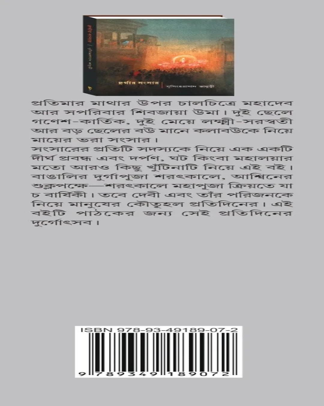 প্রতিমার মাথার উপর চালচিত্রে মহাদেব আর সপরিবার শিবজায়া উমা। দুই ছেলে গণেশ-কার্তিক, দুই মেয়ে লক্ষ্মী-সরস্বতী আর বড় ছেলের বউ মানে কলাবউকে নিয়ে মায়ের ভরা সংসার। সংসারের প্রতিটি সদস্যকে নিয়ে এক একটি দীর্ঘ প্রবন্ধ এবং দর্পণ, ঘট কিংবা মহালয়ার মতো আরও কিছু খুঁটিনাটি নিয়ে এই বই। বাঙালির দুর্গাপূজা শরৎকালে, আশ্বিনের শুক্লপক্ষে-শরৎকালে মহাপূজা ক্রিয়তে যা চ বার্ষিকী। তবে দেবী এবং তাঁর পরিজনকে নিয়ে মানুষের কৌতূহল প্রতিদিনের। এই বইটি পাঠকের জন্য সেই প্রতিদিনের দুর্গোৎসব।
