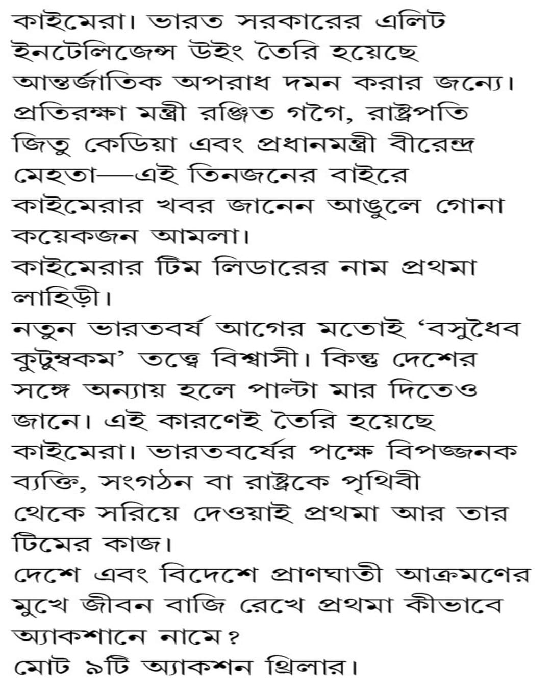 কাইমেরা। ভারত সরকারের এলিট ইনটেলিজেন্স উইং তৈরি হয়েছে আন্তর্জাতিক অপরাধ দমন করার জন্যে। প্রতিরক্ষা মন্ত্রী রঞ্জিত গগৈ, রাষ্ট্রপতি জিতু কেডিয়া এবং প্রধানমন্ত্রী বীরেন্দ্র মেহতা—এই তিনজনের বাইরে কাইমেরার খবর জানেন আঙুলে গোনা কয়েকজন আমলা। কাইমেরার টিম লিডারের নাম প্রথমা লাহিড়ী। নতুন ভারতবর্ষ আগের মতোই ‘বসুধৈব কুটুম্বকম’ তত্ত্বে বিশ্বাসী।