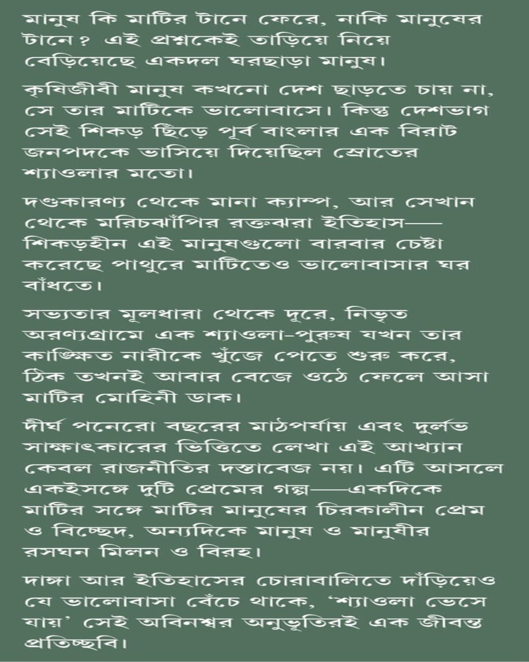 মানুষ কি মাটির টানে ফেরে, নাকি মানুষের টানে? এই প্রশ্নকেই তাড়িয়ে নিয়ে বেড়িয়েছে একদল ঘরছাড়া মানুষ। কৃষিজীবী মানুষ কখনো দেশ ছাড়তে চায় না, সে তার মাটিকে ভালোবাসে। কিন্তু দেশভাগ সেই শিকড় ছিঁড়ে পূর্ব বাংলার এক বিরাট জনপদকে ভাসিয়ে দিয়েছিল স্রোতের শ্যাওলার মতো।