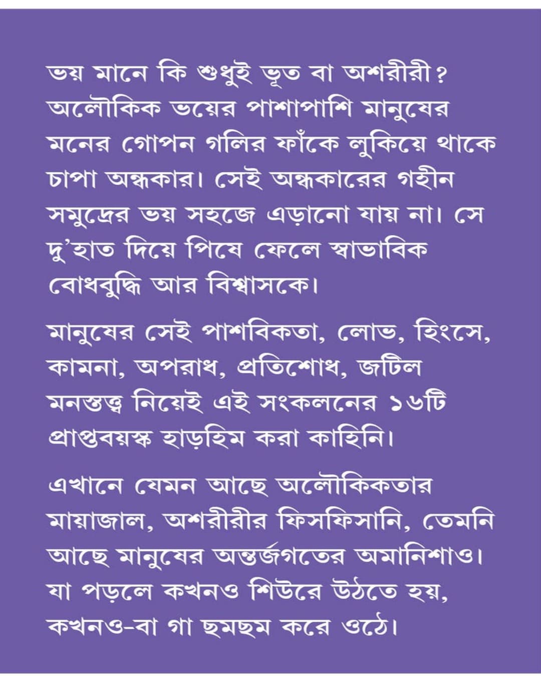 মানুষের সেই পাশবিকতা, লোভ, হিংসে, কামনা, অপরাধ, প্রতিশোধ, জটিল মনস্তত্ত্ব নিয়েই এই সংকলনের ১৬টি প্রাপ্তবয়স্ক হাড়হিম করা কাহিনি। এখানে যেমন আছে অলৌকিকতার মায়াজাল, অশরীরীর ফিসফিসানি, তেমনি আছে মানুষের অন্তর্জগতের অমানিশাও। যা পড়লে কখনও শিউরে উঠতে হয়, কখনও-বা গা ছমছম করে ওঠে।