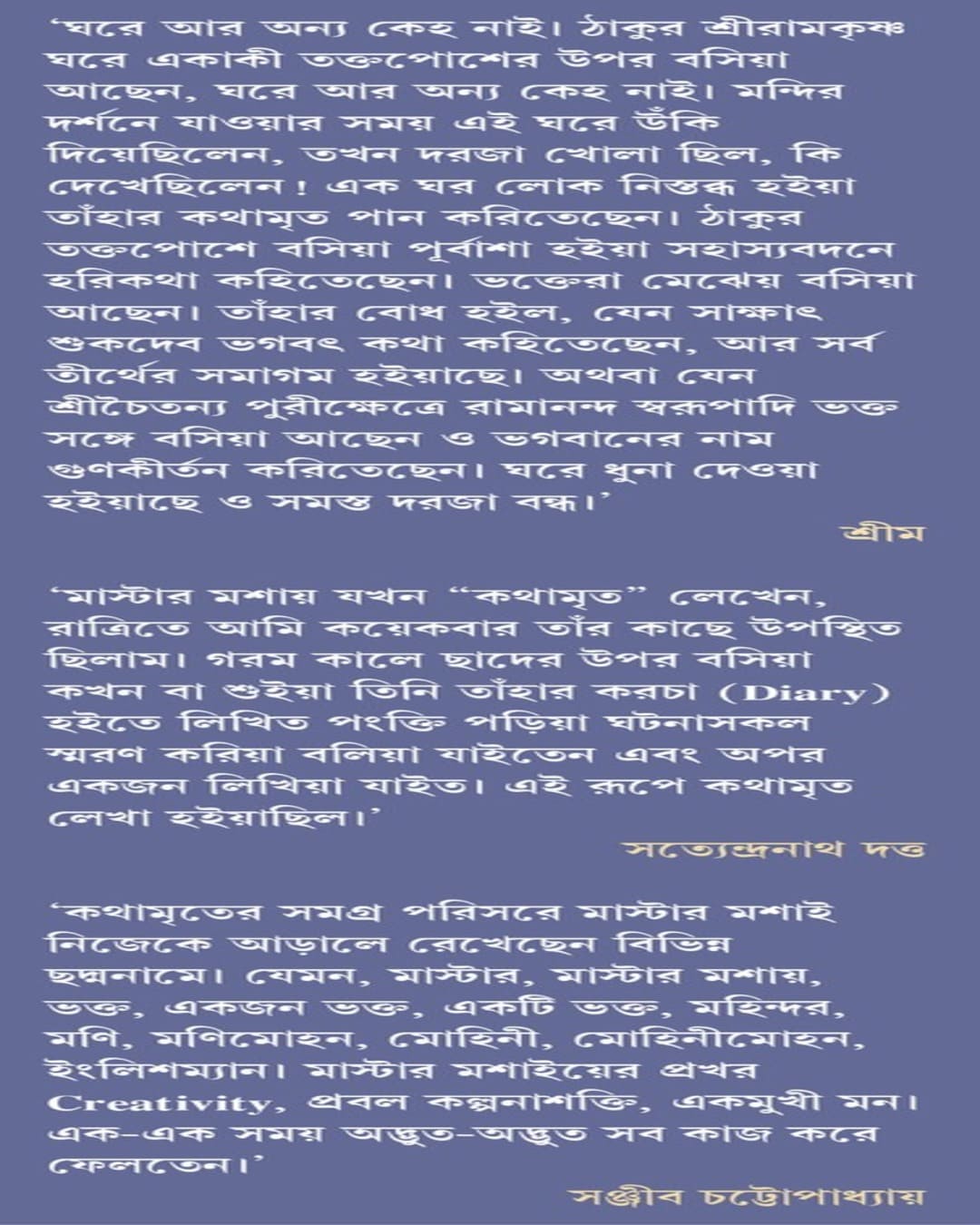 ‘কথামৃতের সমগ্র পরিসরে মাস্টার মশাই নিজেকে আড়ালে রেখেছেন বিভিন্ন ছদ্মনামে। যেমন, মাস্টার, মাস্টার মশায়, ভক্ত, একজন ভক্ত, একটি ভক্ত, মহিন্দর, মণি, মণিমোহন, মোহিনী, মোহিনীমোহন, ইংলিশম্যান। মাস্টার মশাইয়ের প্রখর Creativity, প্রবল কল্পনাশক্তি, একমুখী মন। এক-এক সময় অদ্ভুত-অদ্ভুত সব কাজ করে ফেলতেন।’ সঞ্জীব চট্টোপাধ্যায়