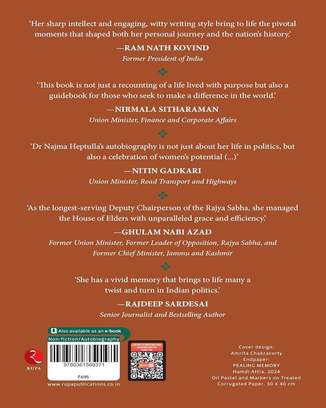 Woven into her political life are personal stories—the untimely death of a beloved brother, a fulfilling marriage, and the demands of balancing motherhood with a successful career. Heptulla contemplates love, loss, tragedy, jealousy, ambition and the grey areas where these emotions reconcile.