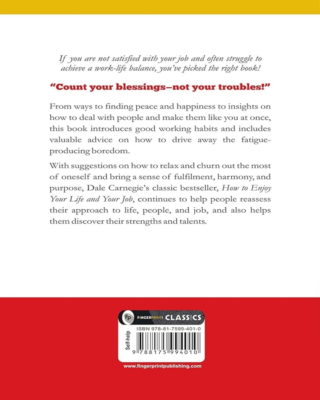 If you are not satisfied with your job and often struggle to achieve a work-life balance, you’ve picked the right book!“Count your blessings—not your troubles!”From ways to finding peace and happiness to insights on how to deal with people and make them like you at once, this book introduces good working habits and includes valuable advice on how to drive away the fatigue-producing boredom. With suggestions on how to relax and churn out the most of oneself and bring a sense of fulfilment, harmony and purpose, Dale Carnegie’s classic bestseller, How to Enjoy your Life and your Job, continues to help people reassess their approach to life, people and job and also helps them discover their strengths and talents.
